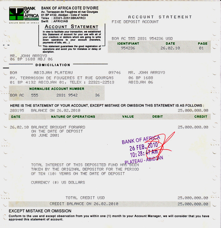 The money is deposited with the BANK OF AFRICA LOCATED IN ABIDJAN THE ECONOMIC CAPITAL OF COTE D' IVOIRE (IVORY COAST) FULL NAME OF MY CLIENT IS: MR.JOHN ARROYO (LATE) THE MONEY IS STILL IN THE BANK OF AFRICA UPTIL DATE. I am attaching in this email the copy of the deposit receipt as prove of deposit by late Mr.Arroyo. Also attached in this email is is the last statement of account of late Mr. Arroyo. If you are sure that you will be discret in handling this transaction without the knowledge of any second party, then we can do business. Like I said before, I do not want anything that will jeoperdise my profession and intergrity. The details provided here are through to the best of my knowledge and God is my witness. I dont want you in anyway to see this deal as a sin or risk because everything will pass through normal legal process without you or me going contrary to any local or international law. If you are ready to work with me, then contact me for further directives. Regards Mr. Ted Apostoleris.