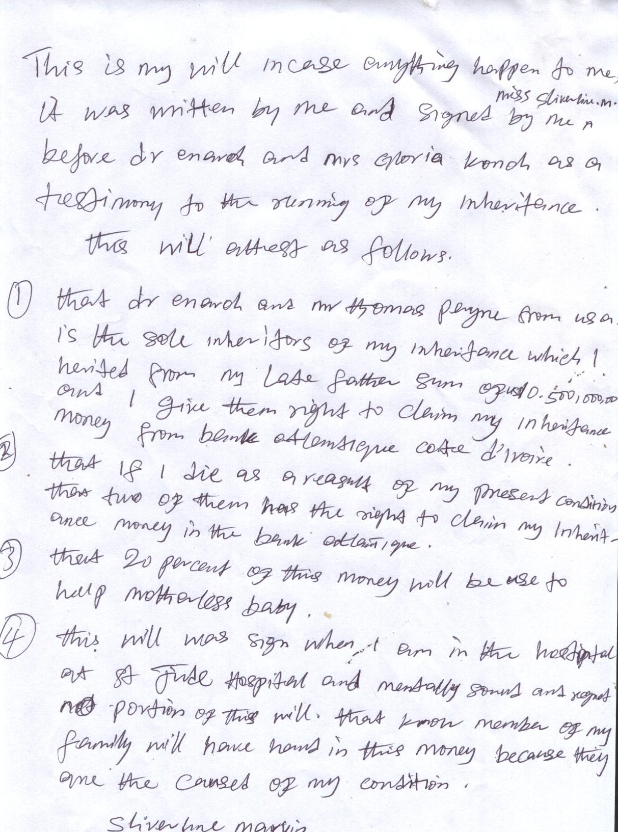 I read your message – I am glad that you feel it is legally secured, as you put it. The only bump in the road as I see is whether the Court will recognize the “deathbed” Will. If the Court does recognize the validity of the Will, then there should be no problem. As to your interpretation that I am the “Trustee Intent”, as you put it, I don’t understand where you got that from. The Will states that 20% is to be used for Motherless Babies, and the remaining should be split between me and the doctor. There is no mention of a Trustee for the funds in the Will. And, as I am sure that you already know this, the Trustee can’t be a Beneficiary. That would be a conflict of interests. The Trustee has to be an uninvolved third person who has no fiduciary interests. The Trustee is named by the Court unless an Executor of the Estate is named in the Will – you are aware of this right? Why would the doctor need me to claim his share of the inheritance? If I choose not to claim my share (which I don’t plan on doing), the Court would still make provisions for the doctor for his share. That’s what I meant when I said we were not dependent on each other. The doctor can claim his money as soon as the Court finishes the Probate process. Please explain this all to the doctor because I don’t think he understand this process. I am still waiting for the Court to contact me, if I don’t hear something soon, I’ll contact them. Thanks for you help and insight. Thomas |